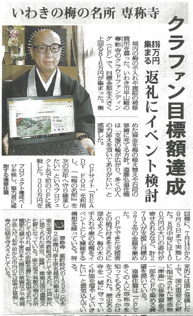 【福島民報社掲載】クラファン目標額達成 返礼にイベント検討