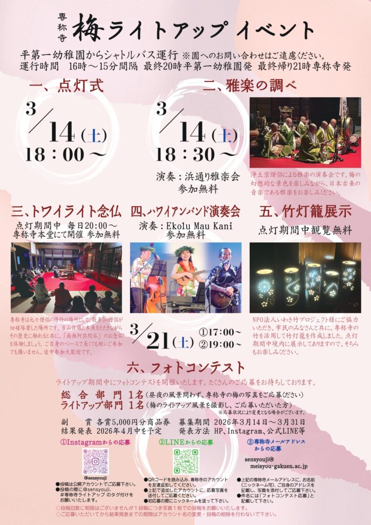 Ekolu Mau Kaniは、いわき市を拠点に活動するフラバンドです。本堂という歴史的宗教空間でフラ音楽を奏でることにより、歴史文化資源(専称寺・梅)、光の演出(ライトアップ)、フラ文化(音楽・舞踊)を融合させました。お楽しみください。