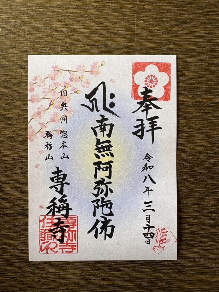 専称寺では、梅の花が美しく咲き誇る季節にあわせ、**「梅福山限定御朱印」(令和8年版)**を頒布いたします。